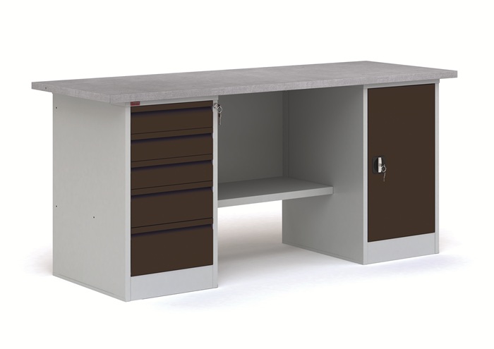 Металлические слесарный верстак ВП-4/1,6 черный представляет собой рабочий стол для ручной обработки металлических, деревянных изделий, а также предметов, выполненных из других материалов. Металлический верстак используется в мастерских, гаражах, автосервисах и в других рабочих зонах. Он являются основой, как небольшого промышленного производства, так и крупного предприятия. Допустимая равномерно распределенная нагрузка на верстак - 1000 кг, на полку верстачную - 40 кг, на выдвижной ящик и полку тумбы - 30 кг. В комплект верстака ВП-4/1,6 черный входит: столешница СТ-1,6 из МДФ, покрытая оцинкованным листовым металлом, комплект К-3/1,6 (стенка задняя металлическая), тумба Т-2 с пятью выдвижными ящиками, тумба Т-1 с двумя съемными полками. Тумбы закрываются ключевым замком. Дополнительно на верстак можно установить два перфорированных экрана соответствующего размера, аксессуары на экран. Цвет: верстак - серый Ral 7035, дверь тумбы - черный муар Ral 7021. Гарантия 1 год. Срок службы 10 лет